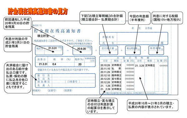 半期分の利息を元金に組み入れた『貯金現在残高通知書』(決算日平成21年3月31日)を作成中です。 加入者のみなさまへのお届けは所属所経由で5月中旬の予定です。