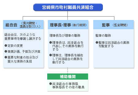 私たちの市町村職員共済組合には、その業務を運営するため、 次のような3つの機関が設けられており、それぞれ役割を分担して共済組合の業務が円滑かつ適正に行われるようになっています。